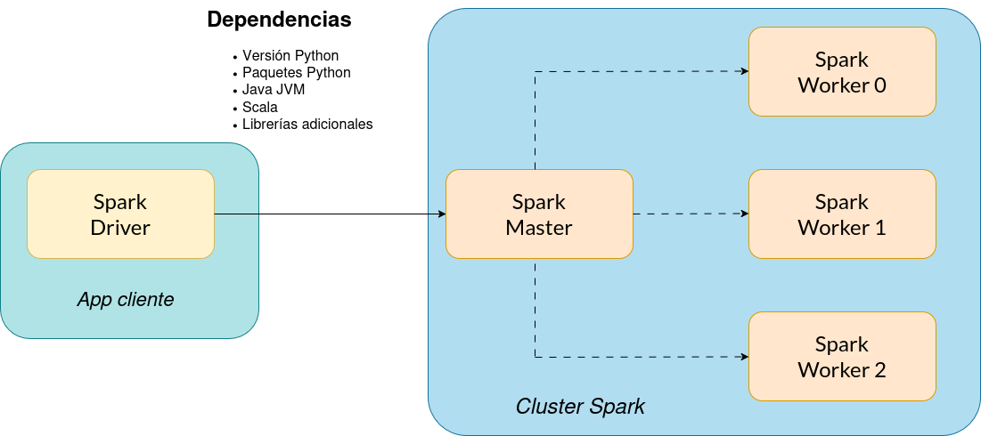 Como podemos observar en la Figura 7.1, una aplicación de Spark que funciona en modo interactivo en nuestro portátil, conectada a un nodo máster que da acceso a un cluster de tres workers de Spark, debe satisfacer múltiples depedencias software para poder funcionar correctamente.